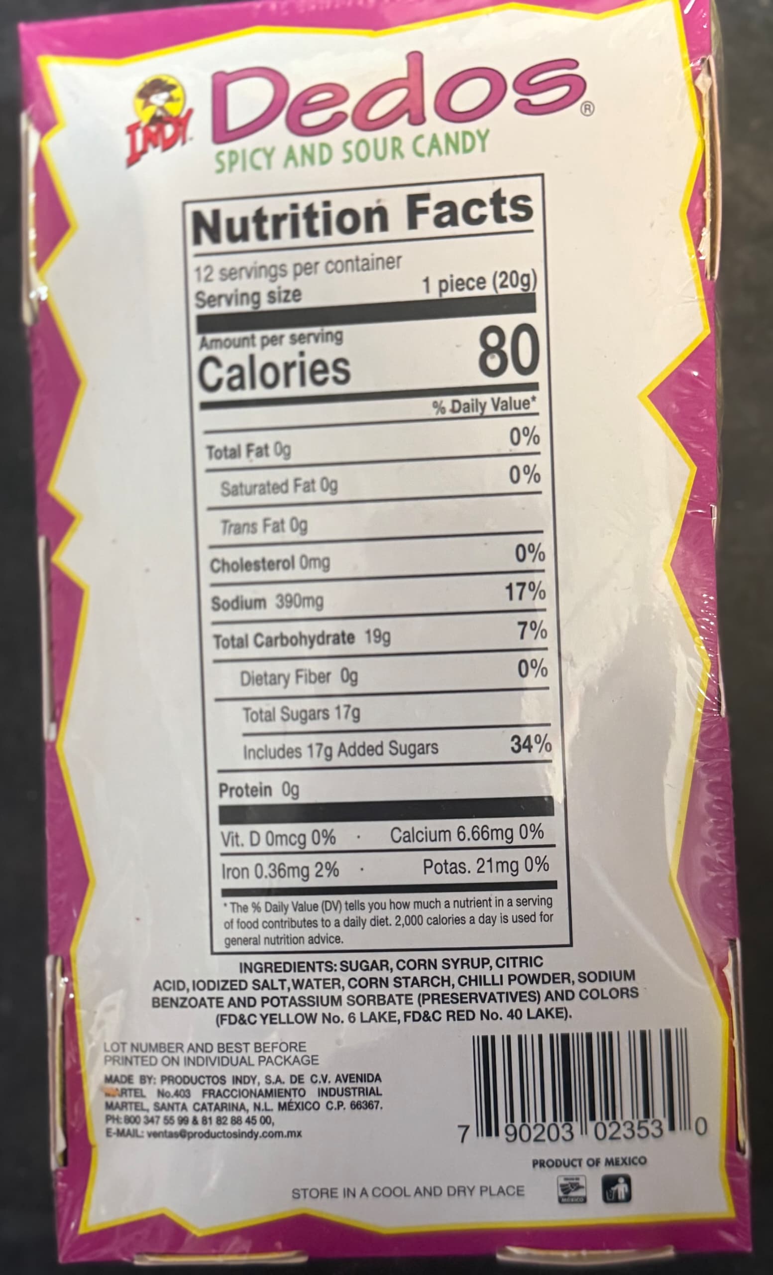This delicious snack comes straight from its country of origin. Packaged in a convenient 12 piece pack, it's easy to carry this snack wherever you go. Whether you're at home or on-the-go, these candies make for an excellent treat for yourself or as a gift for your friends who love spicy snacks. So if you're up for an adventure in snacking indulgence look no further than Indy Dedos Spicy and Sour Chili Candy now available at your fingertips!