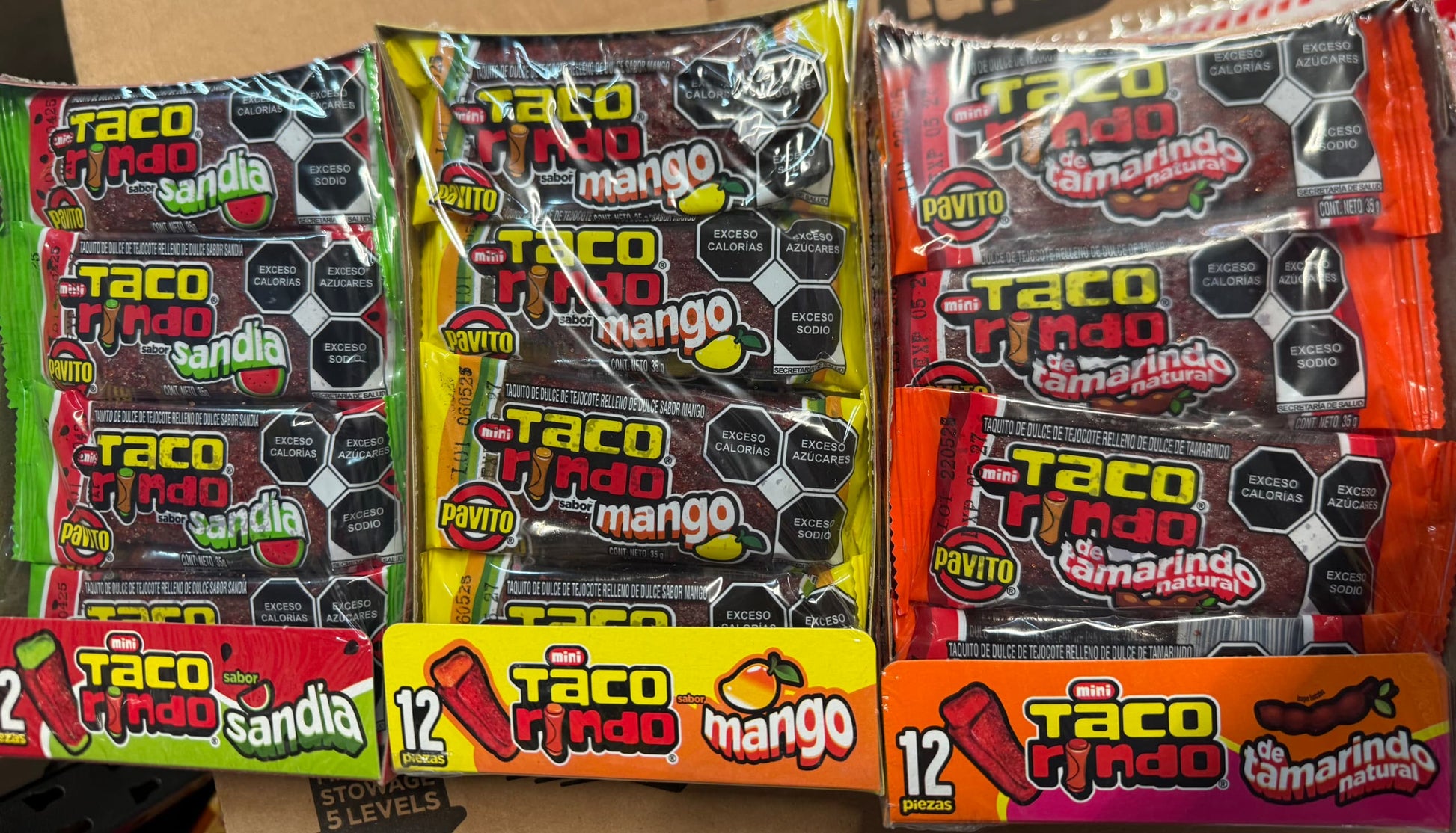 Tacorindo is a Mexican candy, specifically a small, taco-shaped sweet made with ate (a fruit paste) and filled with tamarind candy. It's produced by Tamarindos Pavito and sold in Mexico and the United States, often found in convenience stores like Oxxo. The candy is described as a "Perfect Snack" and is sometimes referred to as "Mini Tacorindo"